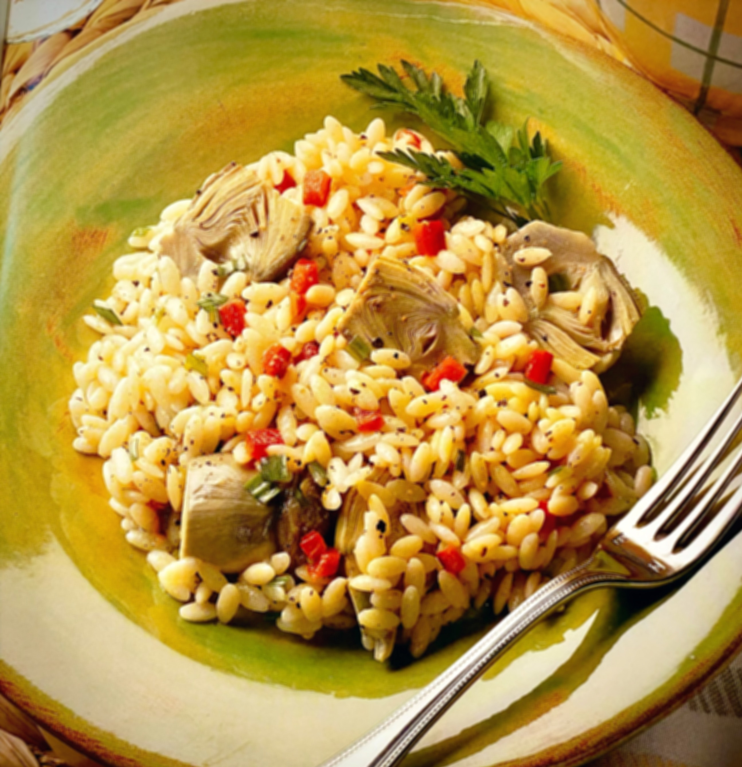 As the orzo cools down, whip up a tangy dressing by mixing together the artichoke hearts, peppers, mustard, vinegar, and tarragon (or parsley) in a small bowl. Lightly stir to combine.
