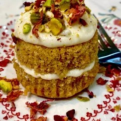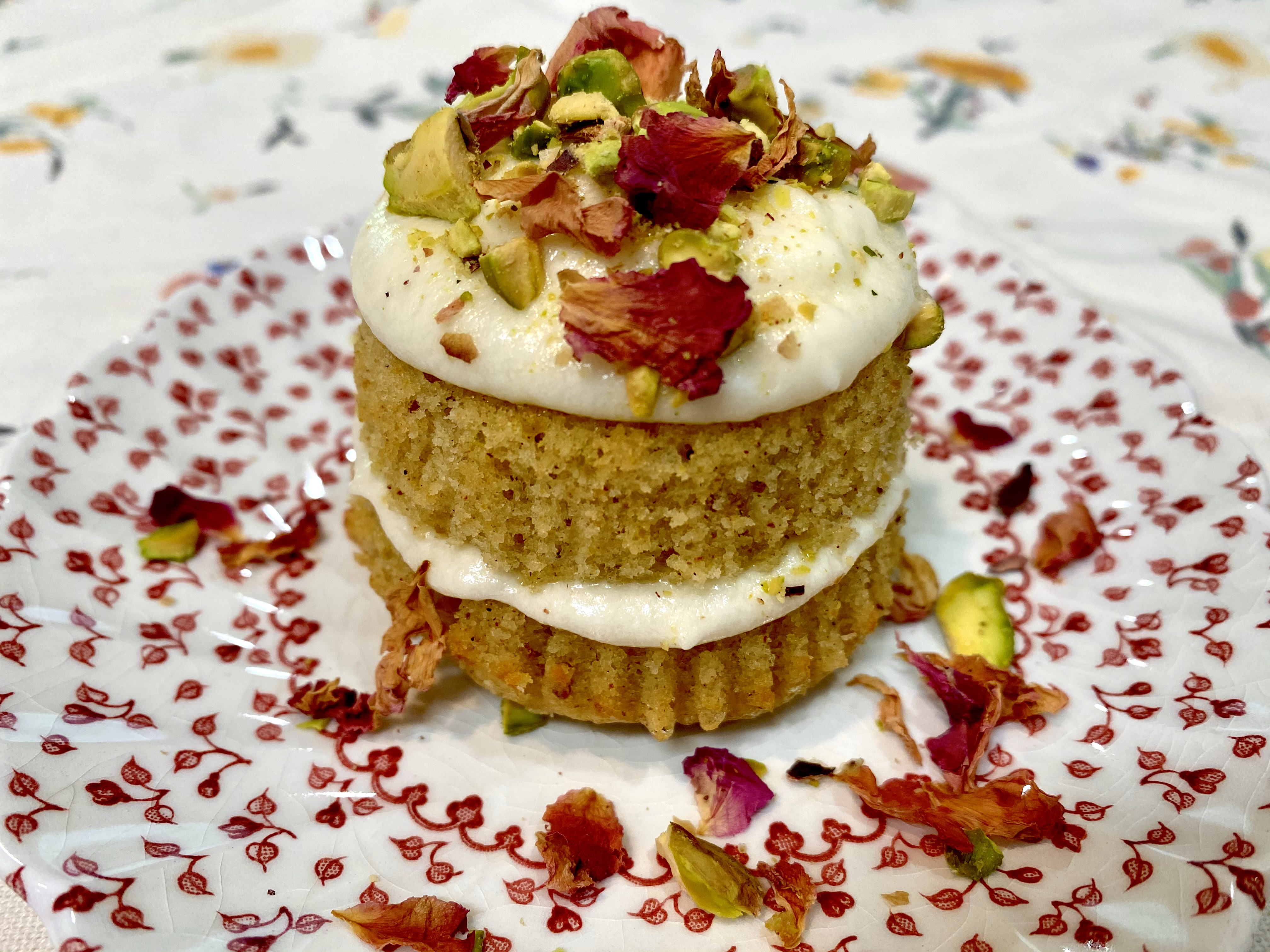 Optionally, garnish with lemon zest, crushed pistachios and/or dried, edible tea roses.