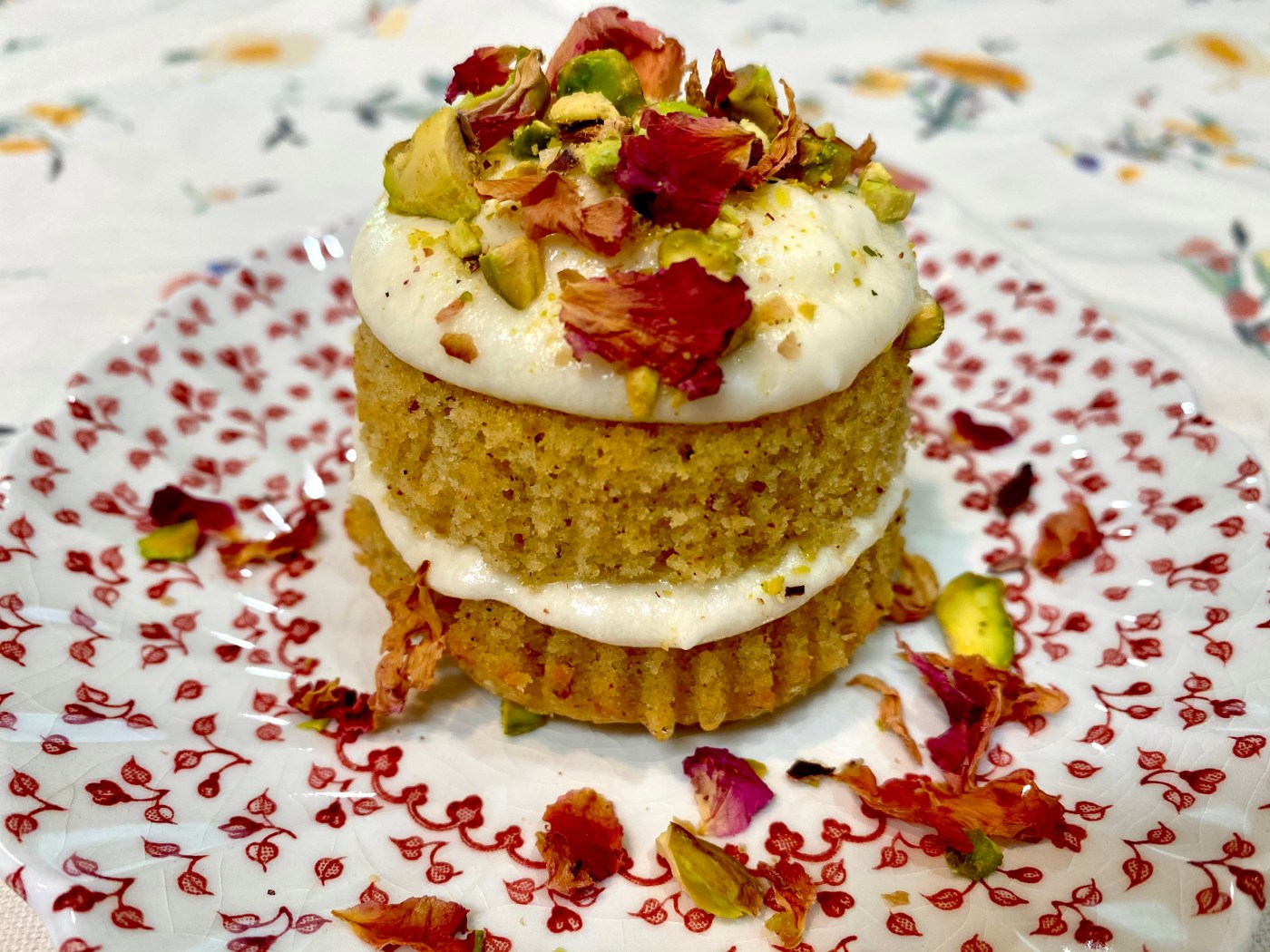 Optionally, garnish with lemon zest, crushed pistachios and/or dried, edible tea roses.