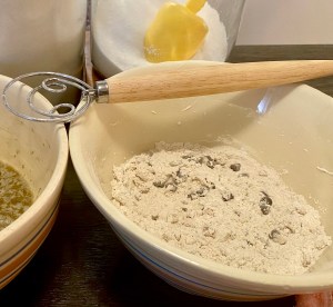 Add the walnuts and chips to the flour and mix them in.