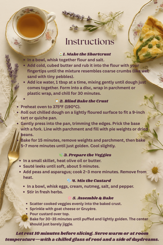 “This quiche is my ode to the season—fresh, floral, and full of light. It reminds me of linen brunches, bare feet in the grass, and the soft clink of teacups in the garden.”