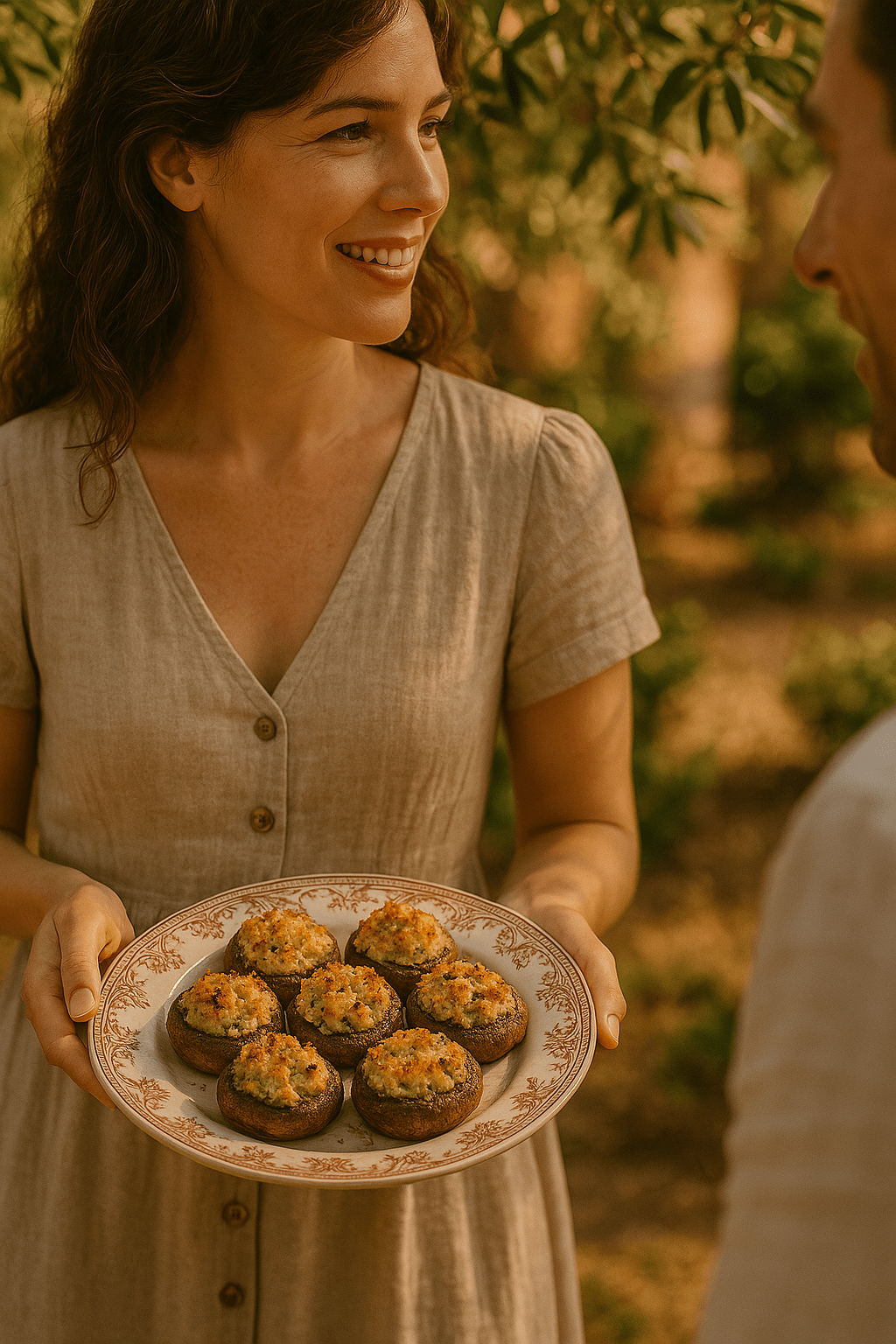 A garden-fresh appetizer: tender cremini mushrooms stuffed with crab, cream cheese, and herbs, then baked to golden perfection.