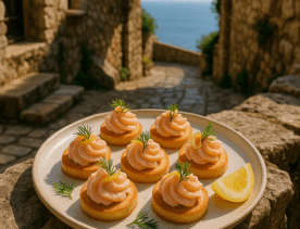 Elegant rounds of salmon mousse, lemon, and dill — the taste of summer brunch by the sea. Perfect for golden hour gatherings.