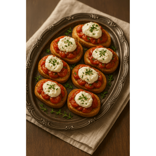 Slow-roasted cherry tomatoes spooned over toasted baguette slices — simple, sun-kissed, and deeply flavorful. Finished with herbed ricotta or burrata, this Provençal appetizer is a celebration of summer abundance. Part of The Gilded Table: July Edition from Life in Bianca’s Kitchen.