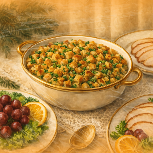 A golden, herb-scented bread stuffing baked to tender perfection â simple, classic, and just right for the Thanksgiving table. This Lion House version captures everything comforting and nostalgic about holiday cooking.